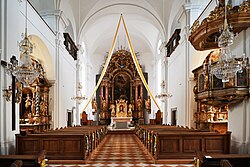 Das vierjochige Langhaus hat insgesamt acht Seitenkapellen. Die über ihnen liegenden Emporengänge sind ungenutzt und gehen übergangslos zum zweijochigen Chor mit Halbkreisschluss über. Sowohl das Langhaus als auch der Chor werden von einem auf Wandpfeilern sitzenden Kreuzgewölbe mit Gurtbögen überspannt. Die Sakristei sowie das Oratorium sind seitlich an den Chor angebaut und über Treppen erreichbar. Im südlichen Teil des Langhauses befindet sich eine dreiachsige Empore.[13]
