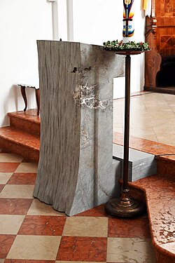Der Ambo hat dieselbe Baumstruktur wie der Altar. Das Lesepult mit seinem Messingstabwerk, das ebenfalls von Markus Jeschaunig gestaltet wurde, erinnert an die Aststruktur eines Baumes.[34]