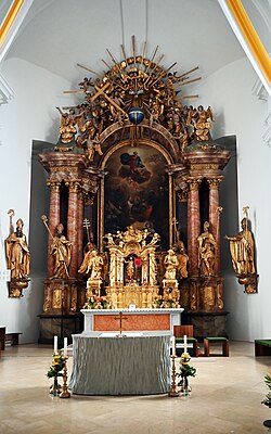 Der Altaraufbau (Retabel) besteht aus Holz mit Marmorierungen, die Lisenen und Säulen tragen den Regenbogen, an dem die einfache Weltkugel, Engelsköpfe und Wolken befestigt sind, zwischen ihnen schwebt die Hl. Dreifaltigkeit in barocker Darstellung. Der Künstler des Bildes ist unbekannt. Es bestehen Ähnlichkeiten zum Altar in St. Gilgen, aber auch dort kennt man den Künstler nicht.[29] Die Säulen tragen korinthische Kapitelle mit Akanthusblättern. Links vom Altarbild befindet sich eine Statue des Hl. Urban, die rechte Statue ist mangels Attribut nicht eindeutig benennbar, wird aber als Papst Sixtus II. benannt (dessen Archidiakon[30] Laurentius, der zweite Patron dieser Kirche ist). Die anderen vier Statuen sind ebenfalls mangels Attributen nicht eindeutig benennbar, die Figur ganz links mit den zwei Kugeln in der Hand könnte der Hl. Nikolaus sein. Aus den Reliefs, die sich unterhalb dieser Statuen befinden, wird abgeleitet, dass die beiden inneren Figuren der Hl. Rupert (Silhouette der Stadt Salzburg) und der Hl. Virgil (Klobenrad, Flaschenzug als Hinweis auf den Dombau) sein könnten. Diese Figuren sind auch den Statuen von Rupert und Virgil an der Salzburger Domfassade ähnlich. Die Statue eines Bischofs rechts auf der Konsole hat kein individuelles Attribut. Ein kleiner Anhaltspunkt im Relief links außen zeigt einen Weihwasserspendenden Bischof und Blitze – es könnte sich bei der Statue um den Hl. Donatus handeln, der gegen Unwetter angerufen wird.[31]