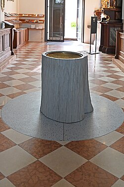 1889 wurden die Lindenbäume vor der Kirche gepflanzt.[17][18] Das Motiv der Baumrinde dieser Bäume wurde mit dem Gedanken „lignum vitae - Holz des Lebens“ von Markus Jeschaunig für die Gestaltung des neuen Hochaltars, des Ambo und des Taufbeckens verwendet.[19]
