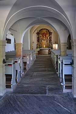 Das ursprünglich flach gedeckte Langhaus wird heute von einer vermutlich 1667 errichteten, gedrückten Stichkappentonne überwölbt. Das etwas eingezogene, spätromanische Chorquadrat wird vom Langhaus durch einen eingeschnürten Fronbogen getrennt. Die östlich an den Chor angebaute, rechteckige Sakristei stammt aus dem Jahr 1667. Im Norden des Chores wurde vermutlich im zweiten Drittel des 18. Jahrhunderts eine rechteckige, von einer Flachkuppel mit abgeschrägten Ecken überspannte Seitenkapelle, die Wieskapelle[1], angebaut. In den nördlichen Schrägen der Kapelle befinden sich Innennischen. Im westlichen Teil des Langhauses befindet sich eine barocke, dreiachsige und zweijochige Empore, welche auf Pfeilern ruht und kreuzgratgewölbt ist.[4]