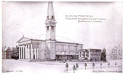 Die Kirche mit mächtigem Saalbau und Rundchor unter einem Satteldach besitzt an der Hauptgiebelfassade einen Säulenportikus über die gesamte Breite und hat nördlich einen freistehenden Kirchturm mit Giebelspitzhelm. An der Eingangswand über den drei Portalen ist ein Fresko Christus der Weltenrichter, davon links Einzug der Krieger in den Himmel mit Heiligen Martin und Maria und rechts die Kirchenlehrer Augustinus, Hieronymus und Chrysostomus und die Dichter Dante und Milton und Künstler Michelangelo, Dürer, Rubens, Signorelli und oben Kampf der bösen Geister ist vom Maler Josef Huber aus dem Jahre 1923.[4] Im Giebelfeld des Portikus ist ein Mosaik Einzug Jesu in Jerusalem von Josef Huber aus 1924.