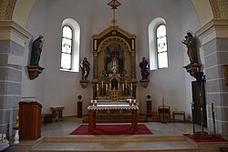 Der Volksaltar ist modern gestaltet. An der Apsiswand hängt ein Bild des heiligen Andreas von 1943. Seitlich stehen barocke Statuen der Heiligen Petrus und Paulus aus dem 18. Jahrhundert.
