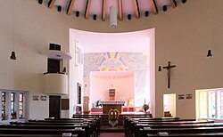 Um den tiefovalen Zentralraum unter einem Kegeldach sind kreuzförmig Anbauten und eingangsseitig ein dominantes Westturmpaar angeordnet. Der Charakter wird durch die kubische Durchgestaltung und das Verhältnis von großflächigen Wandpartien und den relativ kleinen, symmetrisch gesetzten, in der Form variierenden Fensteröffnungen bestimmt. Der Zentralraum ist gedämpft belichtet und kreuzförmig geöffnet. Im Osten befindet sich ein flach gedeckter, erhöhter Chor und im Süden eine kapellenartige Ausweitung mit starker Lichtzufuhr.
