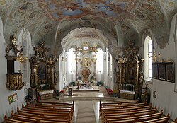Das flachgedrückte Stichkappentonnengewölbe des breiten dreijochigen Saalraumes ist beim eingeschwungenen Triumphbogen konkav eingeschliffen. Der zweijochige Chor hat ein Stichkappengewölbe und eine Pilastergliederung. Auf der Westseite der Kirche befindet sich über dem Eingang eine Doppelempore mit geschwungenen Brüstungen, die dreiachsig auf Säulenpaaren ruht.
