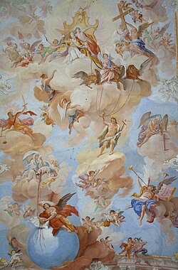 | Deckenfresko im Langhaus der Pfarrkirche in Elbigenalp von Johann Jakob Zeiller; Triumph der Kirche und Erlösungsopfer Christi | Selbst fotografiert | Fesoj | Datei:Elbigenalp1775x.jpg | |