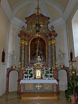 Den Hochaltar als schlichtes Säulenretabel mit einem Kartuschenaufsatz und Opfergangsportalen schuf Johann Franz Walter (1750). Er zeigt ein Leinwandbild Aufnahme des hl. Johannes Nepomuk in den Himmel nach der Schule von Josef von Führich um die Mitte des 19. Jahrhunderts und trägt Polierweißstatuen der Heiligen Josef und Franziskus.