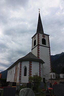 Die 1331 erstmals genannte Kirche ist ein mittelgroßer, gotischer Bau. Der Chor ist etwa gleich breit und gleich hoch wie das Langhaus und endet in einem Dreiachtelschluss. Die mit 1521 bezeichneten Fresken des heiligen Christophorus und einer Kreuzigungsgruppe an der äußeren Südwand wurden 1977 freigelegt. Der mächtige Turm an der Nordseite mit Mauerschlitzen und rundbogigen Schallfenstern wird von einem achtseitigen Spitzhelm bekrönt. Die eisenbeschlagene Tür an der Ostseite des Turmes führt in die Sakristei. Den Aufgang zum Turm bildet die Treppe an der Chornordseite. Die Westempore ist durch einen Treppenaufgang an der Nordseite und eine eisenbeschlagene, spätgotische Tür zugänglich. Man betritt die Kirche durch das erneuerte, spitzbogige Westportal.