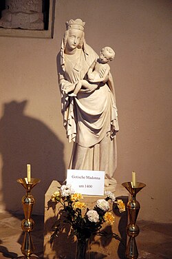 Im Turmerdgeschoß befindet sich die Statue einer gotischen Madonna mit Kind aus Sandstein aus der Zeit um das Jahr 1400, die im Jahre 1990 restauriert wurde. In der nördlichen Vorhalle hängt ein Kruzifix, das aus der Zeit um 1700 stammt.