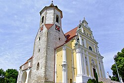 Um das Jahr 1670 entstand unter teilweiser Verwendung mittelalterlichen Mauerwerks eines Vorgängerbaues aus der Mitte des 13. Jahrhunderts nach dreizehnjähriger Bauzeit die frühbarocke Pfarrkirche in ihrer heutigen Form. Von diesem Vorgängerbau ist der Südostturm mit romanischen Untergeschoßen und gotischem Obergeschoß sowie gotische Strebepfeiler am Chor und teilweise am Langhaus erhalten.
