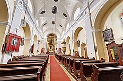 An beiden Seiten des Langhauses befinden sich Rundbogennischen zwischen Wandpfeilern mit vorgeblendeten Pilastern. Das Stichkappengewölbe ist mit Stuckgraten in Rechteck- und Kreisformen kassettenförmig gegliedert. Der Triumphbogen ist mit einer stuckierten Laibung ausgestattet.