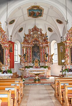 Die Kirche hat eine bemerkenswerte barocke Altarausstattung aus dem zweiten Viertel des 18. Jahrhunderts, welche aus der Kirche auf dem Wiesele hierher übertragen wurde. Die Schnitzfiguren schuf Stephan Föger.