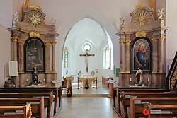 In der Apsis an der Ostwand hängt ein barockes Kruzifix aus Holz aus der zweiten Hälfte des 18. Jahrhunderts mit den seitlichen Statuen der Hll. Ulrich und Wolfgang aus dem Anfang des 16. Jahrhunderts.