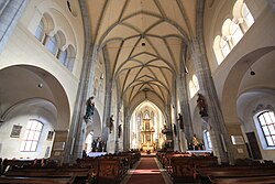 Das Innere des fünfjochigen Langhauses ist ein basilikal gestaffelter dreischiffiger Raum, bei dem rundbogige Pfeilerarkaden das Hochschiff tragen. So ist die romanische Struktur noch deutlich erkennbar. Unter den Kapitellen einiger Wandpfeiler sind Kopfkonsolen angebracht. Der reliefierte, romanische Kämpfer am nordwestlichen Langhauspfeiler zeigt Monstren und Fabelwesen. Das Mittelschiff ist im Bereich des Westwerks deutlich länger als die Seitenschiffe und auch mit einer Breite von 10,6 Metern bei einer Gesamtbreite des Langhauses von 21,3 Metern auffallend breit. Ursprünglich flach gedeckt, erfolgte die Einwölbung mit Netzrippen im Mittelschiff um 1441, die der Platzlgewölbe über den Seitenschiffen in der zweiten Hälfte des 17. Jahrhunderts. Ebenfalls im 17. Jahrhundert wurden über den Seitenschiffen barocke Emporen, deren Öffnungen 1896 neuromanisch verändert wurden, eingebaut. Auf den Schlusssteinen des Langhausgewölbes sind Köpfe und Wappen abgebildet. Eine dreiteilige rundbogige Pfeilerarkatur mit Kreuzgratgewölbe stützt die Westempore, deren Balustrade aus durchbrochenem Maßwerk besteht. An der Front der Empore ist eine Vorzeichnung zum Tod Mariens zu sehen. Ein spitzbogiger Triumphbogen vom Ende des 15. Jahrhunderts verbindet das Langhaus mit dem Chor. Der Chor mit frühgotischem Kreuzrippengewölbe wurde 1326 bis 1333 durch Propst Gerold, dem späteren Bischof von Gurk, errichtet. Das Gewölbe ruht auf Konsolen über Runddiensten, die im unteren Drittel der Wand in Konsolen enden. Auf diesen sind Engel, Köpfe und Blattwerk dargestellt. Köpfe und Blattwerk sind auch die Motive auf den runden Schlusssteinen. An der Nordseite des Chores führt ein spitzbogig profiliertes Portal mit eisenbeschlagener Tür in die Sakristei.
