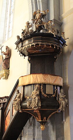 Die um 1790 geschaffene spätbarocke Kanzel wird Johann Reiter zugeschrieben. Am Korb der Kanzel sitzen die Figuren der Evangelisten, auf der Schallmuschel Posaunenengel mit Symbolen der damals vier bekannten Erdteile, wie Kronen, Turban, Federkronen und Tieren, wie Pferde, ein Löwe und ein anatomisch nicht ganz korrekter Elefant.