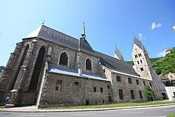 Die Pfeilerbasilika mit mächtigem Zweiturm-Westwerk wurde im 12. Jahrhundert errichtet, der Langchor im ersten Viertel des 14. Jahrhunderts angebaut. Die Obergadenfenster des basilikal überhöhten Mittelschiffs werden von den Dächern der im 17. Jahrhundert hochgeführten Seitenschiffe verdeckt. Die Mauern des Seitenschiffes werden in zwei Geschoßen von Korbbogenfenstern durchbrochen.