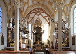 Die Langhaushalle umfasst drei Schiffe und vier Joche. Das stark plastisch kleinflächige und vielseitig durchdrungene Netzrippengewölbe mit Durchstäbungen ruht auf schlanken gekehlten Pfeilern mit barocken Kompositkapitellen bzw. Konsolen in Kombination mit verschiedenen Figurationen. Im breiteren mittigen Schiff zeigen die Netzrippen gerundete Scheitelquadrate. In den Seitenschiffen sind die Netzrippen sternartig angeordnet. Die hallenbreite Westempore mit einem südseitigen Aufgang aus 1629 ist mit einer Stichkappentonne und mit einem Kreuzgratgewölbe unterwölbt. Der spätgotische eingezogene profilierte Triumphbogen ist breiter als das Mittelschiff. Der zweijochige Chor mit einem 3/8-Schluss hat ein im Vergleich mit dem Langhaus höheres Netzrippengewölbe, das sich – stilistisch etwas älter – einachsig symmetrisch und großflächiger zeigt und auf kompositen Kapitellkonsolen ruht. Der Chor hat in der Nordwand ein Stegrahmenportal und zwei Oratoriumsöffnungen aus dem 17. Jahrhundert. In der Südwand des Chores ist eine weite mit Akanthusvoluten stuckierte Arkade aus 1712 zur Marienkapelle. Die Marienkapelle hat ein Stuckfeld im Spiegelgewölbe über kompositiven Eckpilastern. Die kreuzgratgewölbte Sakristei aus der ersten Hälfte des 17. Jahrhunderts hat eine spätgotische Eisenplattentüre mit einem originalen Schloss. Das darüber liegende Oratorium ist kreuzgratgewölbt und die darüber liegende Paramentenkammer hat eine Flachdecke. Das auf Konsolen ruhende Kreuzrippengewölbe im Turmerdgeschoß ist aus der ersten Hälfte des 15. Jahrhunderts. Das verstäbte Schulterportal mit verschraubten Dienstsockeln entstand um 1510. Die Glasmalerei Hll. Josef und Paulina entstand 1883. Die Glasmalerei Verkündigung in der Marienkapelle entstand 1885.