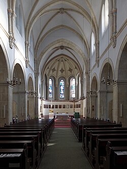 Die mächtige Basilika zeigt auch Heimatstilelemente. Der vorgestellte Nordturm steht seitlich. Die Fassade des Langhauses und des Turmes bildet ein unverputztes Bruchsteinmauerwerk. Das basilikale Langhaus hat neugotische Spitzbogenfenster. Der halbkreisförmige Chor hat hohe Rundbogenfenster. Die Hauptfront gegen Norden hat eine große Fensterrosette, das Hauptportal unter einem Vorgiebel zeigt ein Tympanonmosaik Christus zwischen Engeln mit dem Wappen Liechtenstein. Der seitliche mächtige quadratische Nordturm hat über den Uhren eine offene spitzbogige Laufgalerie und trägt einen Pyramidenhelm.[2]