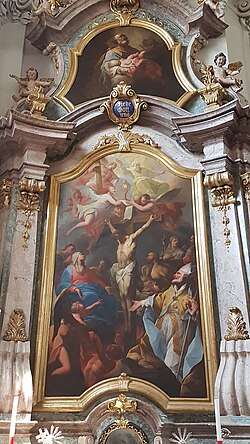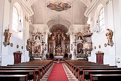 Der Hochaltar wurde ebenfalls von Stumpfegger gefertigt und ist mit 1738 bezeichnet. Die Heiligenstatuen stammen im Wesentlichen vom Bildhauer Josef Anton Pfaffinger (1684–1758). Die Altarbilder am Hochaltar (Engelssturz), am linken Seitenaltar (Sieben Zufluchten) und am rechten Seitenaltar (hl. Johannes Nepomuk mit Engeln) wurden von 1734 bis 1738 vom Salzburger Hofmaler Jacob Zanusi geschaffen.[3]
