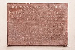 Im Turmerdgeschoß und der Vorhalle der Kirche befindet sich eine Marmortafel mit der Angabe der Kirchweihe am 24. Juni 1738.