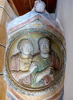 Das Mauerwerk der Kirche beinhaltet Römersteine: Unter der Orgelempore ist ein vorzüglich erhaltenes spätrömisches rundes Halbrelief eines Ehepaares aus der zweiten Hälfte des 2. Jahrhunderts. In der Altarstufe des Seitenaltares ist ein Ornamentstein.