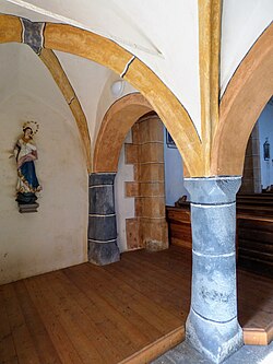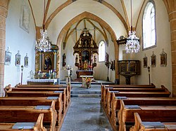An das breite dreijochige Langhaus mit einem eingeschnürten, spitzbogigen Fronbogen schließt ein annähernd gleich breiter, einjochiger, trapezförmiger Chor mit einem Fünfachtelschluss an. Der Chor hat zum Langhaus einen Achsknick. Der Chor ist im Norden des Chorjochs zur Turmkapelle im Erdgeschoß des Nordturmes geöffnet. Langhaus und Chor haben Sternrippengewölbe in der Bauart der Filialkirche St. Helen bei Mühlen. Im Langhaus laufen die Rippen auf leicht eingezogene Strebepfeiler auf, im Chor auf Konsolen. Die Turmkapelle ist kreuzrippengewölbt. Langhaus und Chor haben einbahnige Spitzbogenfenster mit Kleeblattschluss. Im Chor ist eine rechteckige, gotische Sakramentsnische mit darüberliegendem Kleeblattschluss und einem schmiedeeisernen Gittertürchen. Die dreiachsige gotische Westempore ist kreuzrippenunterwölbt und hat eine moderne vorgezogene Holzempore.