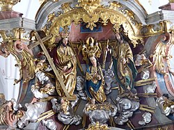 | Sekundärer Kultgegenstand: Dreifaltigkeitsgruppe, Skulptur mit Krönung Marias im Aufsatz des Hochaltares. Anscheinend gehörte diese Gruppe zum Bildprogramm des Flügelaltares von 1499 | Eigenes Werk | Schmeissnerro | Datei:Dreifaltigkeitsgruppe, Skulptur mit Krönung Marias 1499 Großgmain.jpg | |