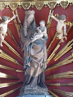 Primärer Kultgegenstand ist eine Salzburger Steingussmadonna aus der Zeit um 1400 in den damals gebräuchlichen Farben Weiß, Blau, Rot nebst Gold.[22] Die Marienstatue in Ypsilonstellung[23] ist ohne Krone 143–144 cm hoch und steht auf einer später hinzugefügten Sockelplatte. Mit der linken Hand trägt sie ein nacktes Kind, das mit beiden Händen einen Apfel hält. Die Figur wurde seit ihrer Entstehung mehrmals verändert. 1871 entkleidete man die Marienstatue, da dieselbe durch das öftere Anziehen und Wegnehmen der Kleider nicht selten beschädigt wurde […] indem Jesukind beide Hände u. ein Vorfuß abgebrochen sind.[24] Zwischen 1962 und 1964 erfolgte eine akribische Restaurierung und versucht, den originalen Zustand wiederherzustellen. Seit 1739 steht die Statue im Zentrum des Hochaltares, zuvor, ab 1539, war sie auf einem Choraltar hinter dem Hochaltar aufgestellt gewesen. Vor 1539 war sie überhaupt außerhalb der Kirche angebracht. Die Legende, nach der bei der Übertragung der Marienfigur dieselbe 1539 herabgestürzt und zerbrochen sei, konnte am Röntgenschirm (1965) bestätigt werden. Mehrere Eisenstäbe halten in der Kniepartie die Statue zusammen.[25] Die im Sockel eingravierte Zahl 1453 dürften in Zusammenhang mit einem besonderen Ereignis stehen (Fall Konstantinopels ?), oder mit dem öffentlichen Aufstellen der davor privat verehrten Madonna.
