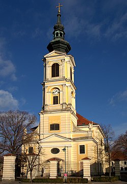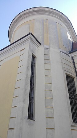 Der hohe frühklassizistische Kirchenbau erhebt sich über einem quadratischen Grundriss. Der Chorraum ist apsidal geschlossen und wird im Bogenscheitel um einen quaderförmigen Annex erweitert, der als Hochaltargehäuse dient. Sowohl der Chor als auch der Westturm werden seitlich von zweigeschoßigen Anbauten ergänzt, die im Osten an den Außenflanken um je einen runden Treppenturm mit Glockenhelm erweitert werden.