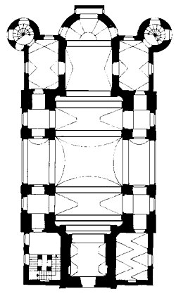 Im westlichen Joch liegt die Orgelempore, die mit den Oratorien auf der westlichen Seite des Langhauses verbunden ist. Der Zugang zur Empore und den mit ihr verbundenen Oratorien erfolgt über eine Treppe, die in einem Raum nördlich der Turmfassade liegt. Der Kirchenraum ist von einem umlaufenden Gebälk mit Triglyphenfries gegliedert, das sich unter einem weit vorkragenden Kranzgesims befindet und auf toskanischen Pilastern aufliegt.