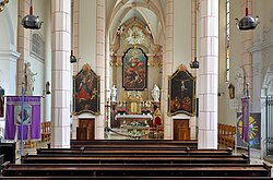 Die Kirche dominiert am Kirchenplatz mit dem danebenliegenden Deutschordensschloss in erhöhter Lage als ehemalige Burgkirche mit ehemals wehrhafter Kirchhofmauer und Wassergraben die Marktgemeinde.