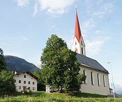 Die Kirche liegt an der Lechbrücke am Nordostrand des Straßendorfes. Das vierjochige Langhaus als breiter Saalraum mit einem Stichkappentonnengewölbe wurde mit einer dichten Schablonendekorationsmalerei von Johann Kärle ausgemalt. Das Langhaus hat im Westen eine Doppelempore auf vier Säulen. Der eingezogene Chor hat einen 3/8-Schluss.