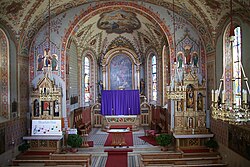 Johann Kärle malte 1872/1882 Fresken, in der Chorbogenlaibung links bevorrangt Jesus und Maria und ferner Magnus, Theresia, Hedwig, Isabella, Margaretha und Monika, Engel und Taube des hl. Geistes, in der Chorlaibung rechts bevorrangt Vinzenz von Padua und Antonius und ferner Stephan, Ludwig, Alfons und Thomas, Elias und Moses. Am Chorbogen links malte Kärle Krönung Mariens und rechts Erzengel Michael. Kärle malte weiters in den Stichkappen und Dreipässen, links Judith und Holofernes, Krieger mit kniender Frau, Zacharias, Elisabeth und Anna, Jesus im Tempel, und rechts Verkündigung und Heimsuchung. Die Glasfenster mit den Heiligen Jakobus und Andreas, Bartholomäus und Matthäus schuf 1887 die Tiroler Glasmalereianstalt Innsbruck.