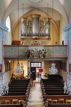| Innenansicht der röm.-kath. Stadtpfarrkirche „St. Philipp und Jakob“ in der niederösterreichischen Stadt Hainburg an der Donau in Richtung Orgelempore. Die frühbarocke Kirche wurde zur Wende des 17./18. Jahrhunderts errichtet, wobei der Chor im Kern gotisch ist. 1756 wurde von Mathias Gerl der barocke Westturm angebaut. Die Orgel ist ein Werk von Orgelbau Reinisch-Pirchner (Johann Pirchner) und wurde 1982 anlässlich des 250. Geburtstages Haydns 1982 errichtet. | Eigenes Werk | C.Stadler/Bwag | Datei:Hainburg (NÖ) - Kirche, Innenansicht (Orgelempore).JPG | |