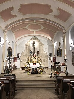 Die nach außen eher schmucklose Kirche wird bekrönt von einem Dachreiter mit barocker Haube (Schindeldach und Turmkreuz 2013 erneuert). Im Inneren überrascht die Geräumigkeit – ein lichtes, vierjochiges Langhaus und ein einjochiger Chorraum mit geradem Schluss. Das Kirchengewölbe mit Stuckfelderteilung stammt aus der ersten Hälfte des 18. Jahrhunderts und wurde bei den letzten Renovierungen in den Originalfarben der Barockzeit ausgemalt.