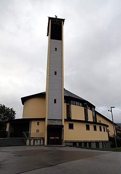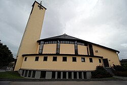 Die freistehende Kirche mit einem Turm unter einem Kegeldach beinhaltet auch das Pfarrzentrum mit einem Kindergarten und einer Bücherei.