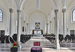 Das dreischiffige fünfjochige Langhaus mit einem hohen Mittelschiff und niedrigeren Seitenschiffen ist in allen Schiffen rautenfeldrig kreuzgratgewölbt, den Übergang vom Mittelschiff zu den Seitenschiffen bilden Bogenarkaden mit profilierten Rundstäben auf Säulen und Kapitellen mit neuromanischem Akanthus- und Kreuzblumendekor. Die Gurtbögen ruhen auf Wandlisenen. Der Chorbogen im Mittelschiff hat zwei starke Rundrippen mit Hohlkehle. Der Chorbogen wurde bei der Restaurierung 1980 zugemauert. Die Seitenschiffe schließen mit Rundapsiden ab. Der abgetrennte eingezogene Chor mit Rundapsis wurde 1980 durch eine eingezogene Decke zweigeschoßig, das Untergeschoß wurde Sakraments- und Werktagkapelle mit einem Portal zur Sakristei, das Obergeschoß wurde ein Meditationsraum. Die einjochige fünfachsige Westempore hat ein Kreuzgratgewölbe auf Säulen.