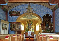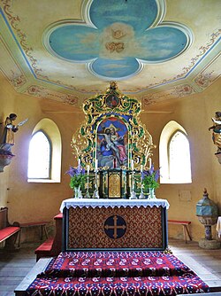 Das Altarblatt des um 1720 entstandenen Hochaltars mit geschnitzter Blatt- und Bandlwerksrahmung zeigt einen Gnadenstuhl. Den rechten, neobarocken Seitenaltar schuf 1905 Mathias Slama.