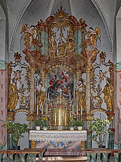 Der Hochaltar, ein viersäuliger, filigran wirkender Ädikula-Altar mit Opfergängen, füllt den Chorschluss in ganzer Höhe und Breite aus. Er stammt aus der Mitte des 18. Jahrhunderts. Das Altarblatt zeigt den heiligen Martin mit einem Bettler. Seitlich stehen die Statuen der Heiligen Johannes der Täufer, Josef, Petrus und Paulus. Die Schnitzgruppe im Aufsatz stellt die Marienkrönung dar.