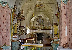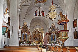 Das Tonnengewölbe des 17. Jahrhunderts im Langhaus wird durch Stichkappen und Gurtbögen mit Rosetten in vier Joche unterteilt. Die stark eingezogenen Wandpfeiler bilden spitzbogige Arkaden. Die Stuckfelder und Gewölbeanläufe werden durch eine Schuppenrahmung betont. Die leicht vorschwingende Orgelempore ist kreuzgratunterwölbt. An der Orgelbrüstung ist das Wappen der Lodron zu sehen. Südlich des östlichen Langhausjoches ist eine Kapelle mit einem Kreuzgratgewölbe angebaut. Südlich des kreuzgratgewölbten Turmquadrats befindet sich die Sakristei mit einem Oratorium im Obergeschoß. Neben dem Sakristeieingang wurde der Steinbogen des ehemaligen Portals eingemauert. Das Turmquadrat öffnet sich mit einem rundbogigen Triumphbogen zum Langhaus und mit einem Spitzbogen zum Dreiachtelchorschluss.
