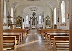 Die Kirche ist eine weite, lichtdurchflutete Saalkirche mit flachem Tonnengewölbe und Stichkappen. Sie hat fünf Langhausjoche und eine Raumfläche von rund 1000 m². Der Kirchenraum ist durchgehend durch Riesenpilaster gegliedert. Der Triumphbogen ist korbbogenförmig. Die Kirche weist zart strukturierte Stuckgesimse auf. Die Holzempore für die Orgel ruht auf toskanischen Säulen. Unter der Empore sind an der inneren Westseite seitlich des Eingangsportals vier kleine Pilaster.