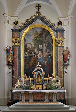 Der Hochaltar ist ein giebelartig bekrönter und durch Pilaster flankierter Retabelaufbau über einer schlichten Mensa. Der Tabernakel am Hochaltar mit vergoldetem Schnitzwerk ist eine Arbeit des Künstlers Christian Moosbrugger aus dem Jahr 1948. Er gestaltete ihn nach Plänen von Edmund Beckmann. Die flankierenden Engelsfiguren wurden 1950 von Edmund Beckmann ergänzt. Das Hochaltarbild wurde 1852 von Josef Bucher gemalt und stellt das „Opfer der Weisen aus dem Morgenland“ dar. Auf dem Bild ist bildmittig das Jesuskind mit blonden Locken dargestellt. Es sitzt auf dem Schoß seiner Mutter Maria. Die beiden werden von den Heiligen Drei Königen und ihren Begleitern umringt.