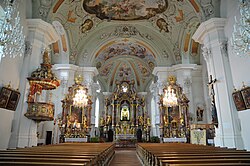Es handelt sich um einen Doppelturmbau mit prächtigen Fenstern. Der helle Kirchenraum ist mit zierreichen Gewölben ausgestattet. Die Deckenfresken wurden 1764 von Johann Weiß geschaffen und zeigen im Haupt- und Querschiff die Glorie des Himmels mit der hl. Dreifaltigkeit, umgeben von Engeln und Heiligen, die Vertreibung aus dem Paradies, die Kreuzigung, das Pfingstwunder und das Jüngste Gericht. Die Fresken im Chorraum über den Seitenemporen zeigen links die Taufe Jesu und rechts den hl. Johannes Nepomuk kniend zu Füßen der Madonna. Die Bilder über dem Hochaltar mit Heiligendarstellungen malte Balthasar Waltl im Zuge der Kirchenrenovierung 1891/93.