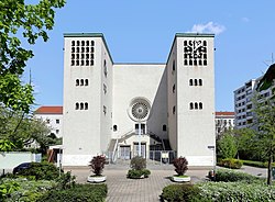 | Südansicht der röm.-kath. Pfarrkirche Königin des Friedens an der Adresse Buchengasse 158 im 10. Wiener Gemeindebezirkes Favoriten . Der moderne Stahlbeton-Sakralbau wurde ab Herbst 1933 (Grundsteinlegung am 3. September 1933) nach Entwürfen der Architekten Leo Schmoll und Robert Kramreiter errichtet und am 16. November 1935 eingeweiht. Die Kirche hat eine Länge von 52 Meter und eine Breite von 22 Meter. Die Höhe des Kirchenschiffs beträgt 16,5 Meter und ihr maximales Fassungsvermögen beläuft sich auf etwa 3000 Personen, davon 480 Sitzplätze. | Eigenes Werk | C.Stadler/Bwag | Datei:Favoriten (Wien) - Kirche Königin des Friedens.JPG | |