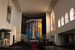 | Innenraum der Pfarrkirche Königin des Friedens, Wien-Favoriten (Altarbild durch Fastentuch verhängt) | Eigenes Werk | DerHHO | Datei:Königin des Friedens Innen Fastentuch.jpg |