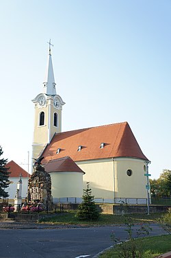 Die Kirche ist ein rechteckiger Bau mit einer gleich breiten und rund geschlossenen Apsis. Der vorgebaute Westturm ist dreigeschoßig und hat einen Spitzhelm. Die Dekoration stammt aus dem 19. Jahrhundert. Das Südportal hat einen Vorbau. Nordseitig schließt die Sakristei und ein Abstellraum unter einem Schleppdach an.