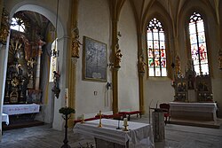 Südlich am Chor steht die tonnengewölbte Sakristei – wohl als Rest der romanischen Vorgängerkirche – mit einem fragmentierten 1950/1951 restaurierten Freskenzyklus Christus in der Mandorla und Evangelistensymbole sowie die Zwölf Apostel in vertieften Nimben in frühgotischen Spitzbogenarkaden eingestellt. Nördlich am Chor steht eine gotische Kapelle, heute Johann-Nepomuk-Kapelle, mit einem Kreuzrippengewölbe, und barocker Dekorationsmalerei aus der zweiten Hälfte des 18. Jahrhunderts.