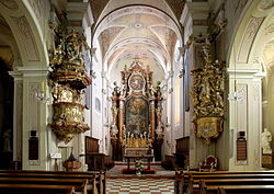 Das Langhaus hat drei Schiffe und vier Jochen. Im hohen Mittelschiff befinden sich queroblonge Joche. Bei der Barockisierung von 1726 wurde eine Neuwölbung durch eine Stichkappentonne zwischen kräftigen Gurtbögen sowie eine Umgestaltung der gotischen Pfeiler durch allseits vorgelegte Pilaster mit ionischen Kapitellen und Kämpfern vorgenommen. Zu den Seitenschiffen führen flachbogige Pfeilerarkaden. Darüber liegen Blendoratorien mit Segmentbogenöffnungen und Balustraden. Die Seitenschiffe verfügen über längsoblonge, kreuzgratgewölbte Jochen zwischen Gurten, die im Osten jeweils um ein rechteckiges Kapellenjoch mit rundbogigem Durchgang zum Chor verlängert sind. Die dreiteilige, flachbogige Orgelempore ist im Bereich des Mittelschiffs stichkappenunterwölbt und an den Seiten kreuzgratgewölbt. Der leicht erhöhte und eingezogene Chor mit abgerundetem Schluss ist dem Langhaus entsprechend gewölbt und gegliedert und verfügt über Oratorien mit Segmentbogenöffnungen. Die Sakristei im Norden hat eine Flachdecke, während die Südsakristei kreuzgratgewölbt ist.