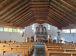 Der Zentralbau hat einen achteckigen Grundriss mit langen Schrägwänden unter einem flachen Satteldach. Das Kircheninnere hat eine Holzbalkendecke mit einer Fensterzone seitlich am Dachansatz. Rechts vom Eingang ist die Taufkapelle mit dem Glasgemälde Johannes der Täufer der Tiroler Glasmalereianstalt (um 1890).