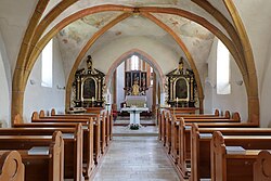 Im Langhaus ruht ein niedriges Kreuzrippengewölbe aus der zweiten Hälfte des 15. Jahrhunderts auf runden Wandvorlagen. Die reliefierten Schlusssteine geben das Lamm Gottes und die segnende Hand wieder. Ein spitzbogiger Triumphbogen verbindet das Langhaus mit dem Chorturmquadrat. Im romanischen Chorturmquadrat wurde Ende des 15. Jahrhunderts ein älteres gotisches Gewölbe durch ein spätgotisches Sternrippengewölbe ersetzt und in der Höhe der gleichzeitig entstandenen östlichen Chorerweiterung angepasst. In der einjochigen Chorerweiterung mit Fünfachtelschluss und drei spätgotischen zweibahnigen Maßwerksfenstern erhebt sich ein Netzrippengewölbe über Runddienste. Die quadratische Südkapelle und deren Apsis sind kreuzrippengewölbt und durch eine spitzbogige Arkade zum Turmjoch hin geöffnet. Ein gotisches Portal mit Eisenplattentür führt in die Sakristei.